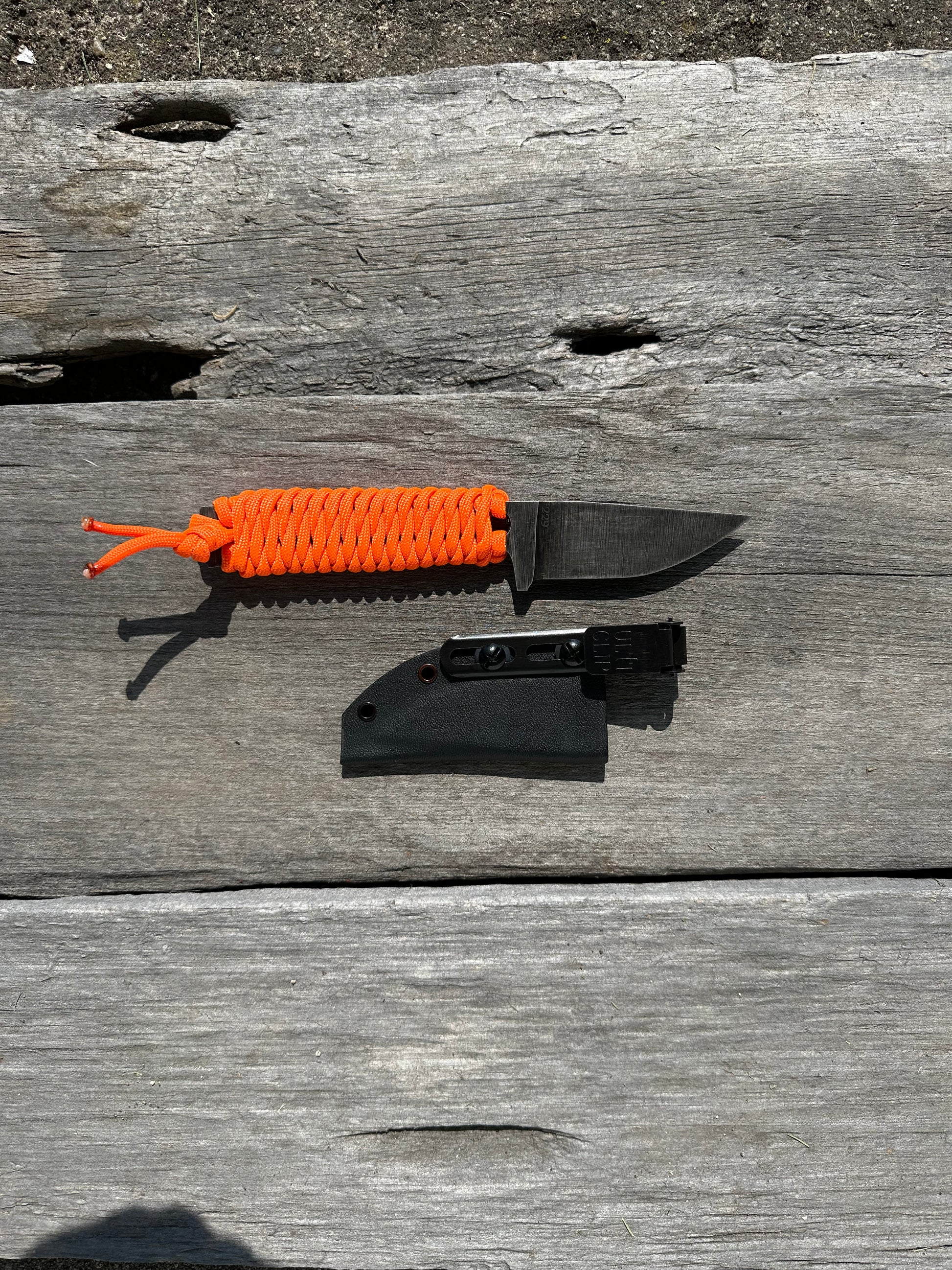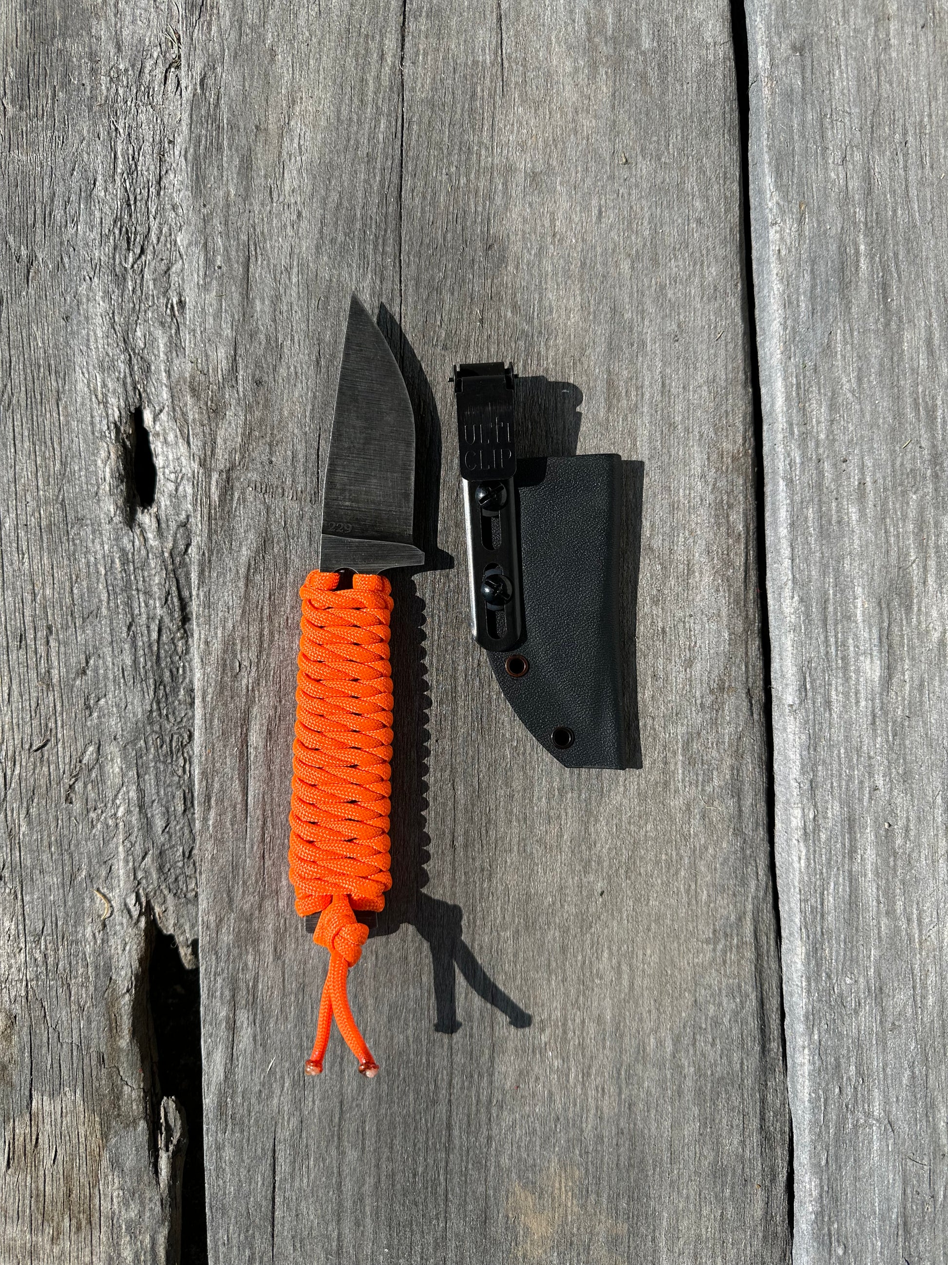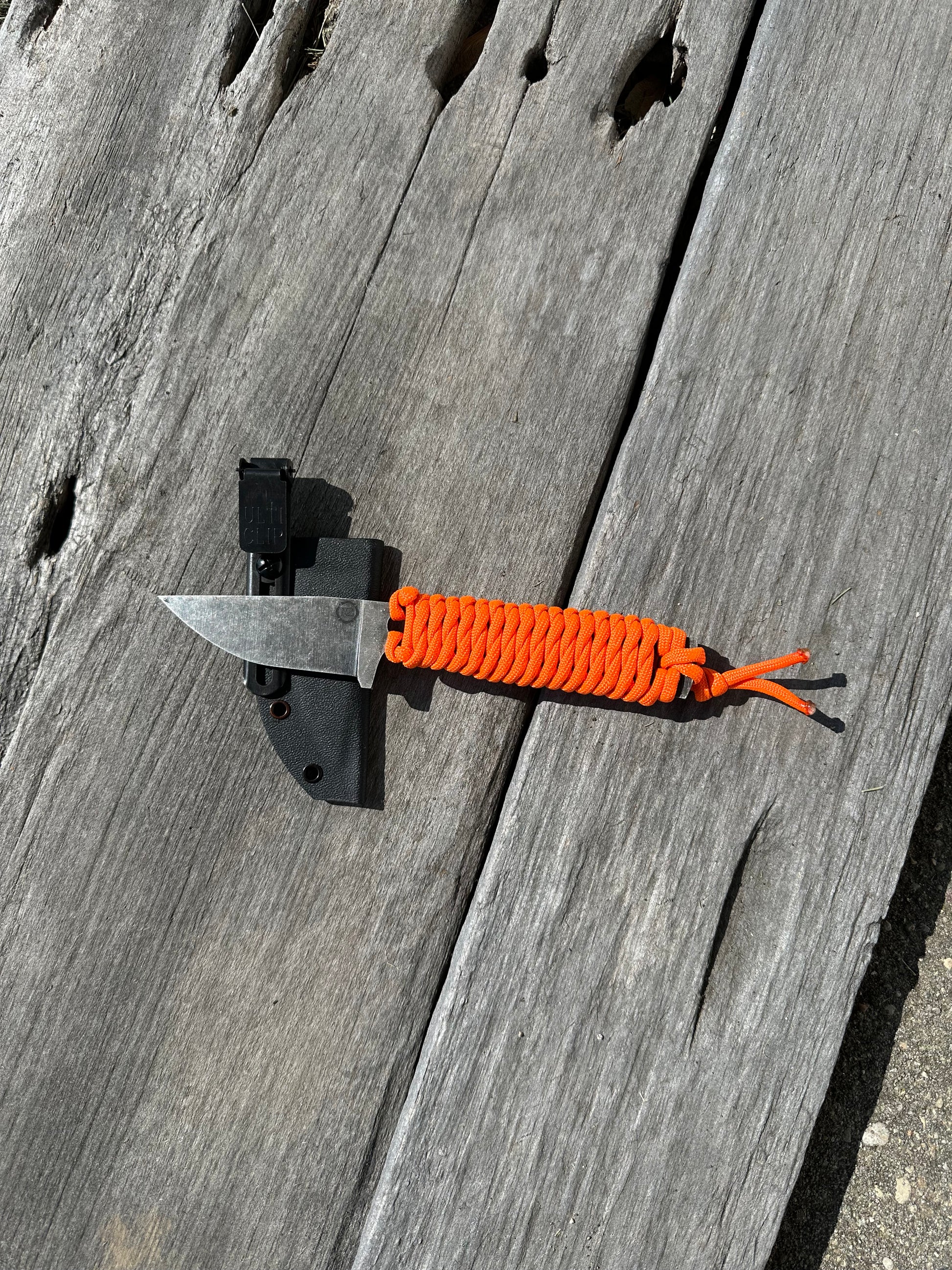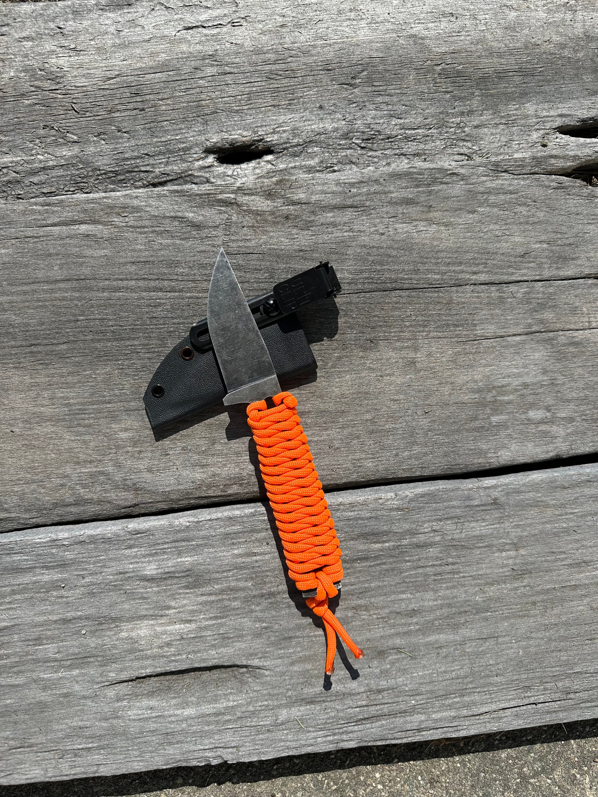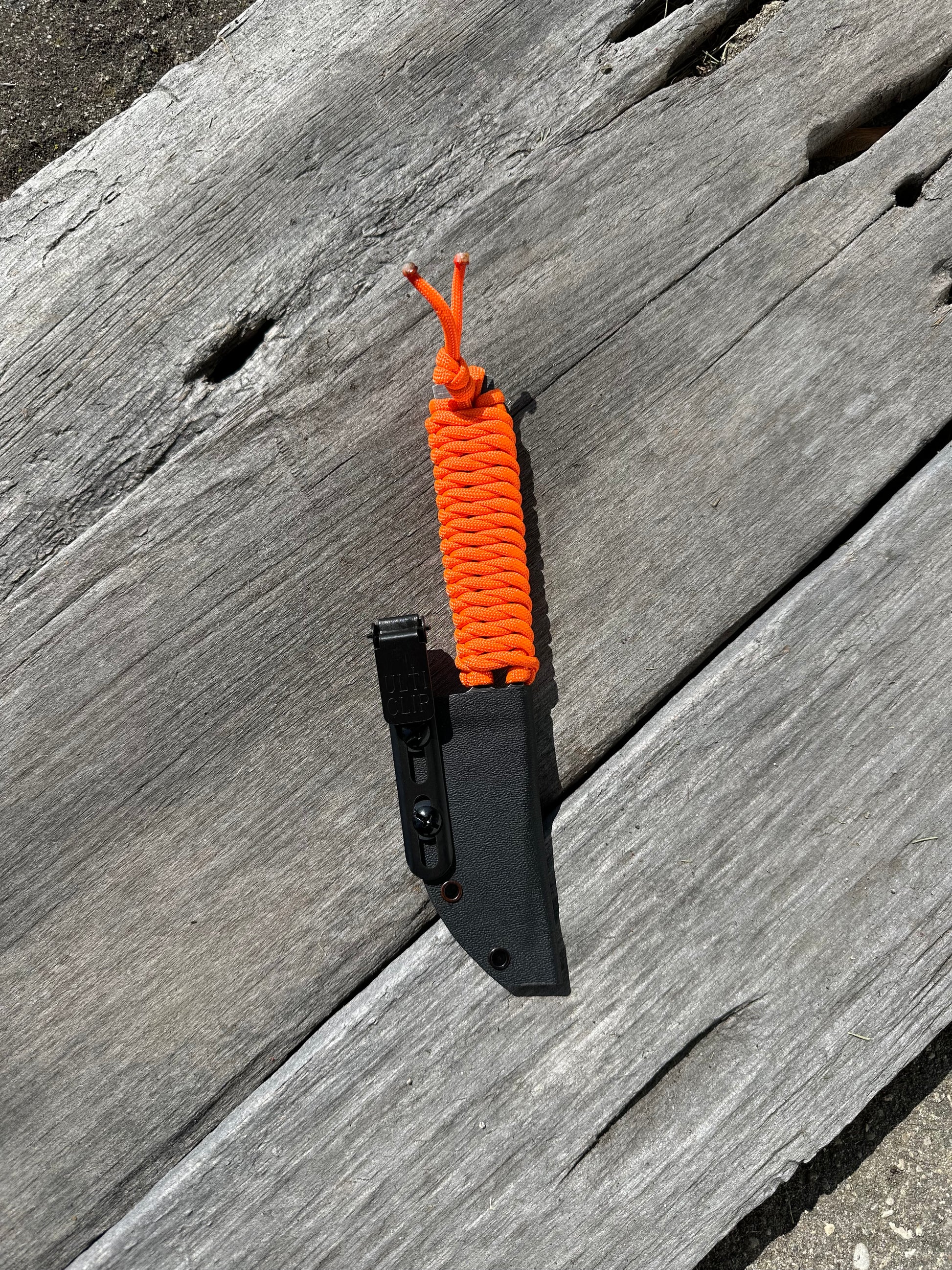 The frequent flyer is the knife you’ll have in your pocket every day! With a full flat grind and paracord handle, this knife is lightweight and still tough as nails. The blade has been acid etched and given a stonewashed finish. On this variation of the frequent flyer, the orange paracord handle can help you find your knife if you happen to drop it or misplace it.