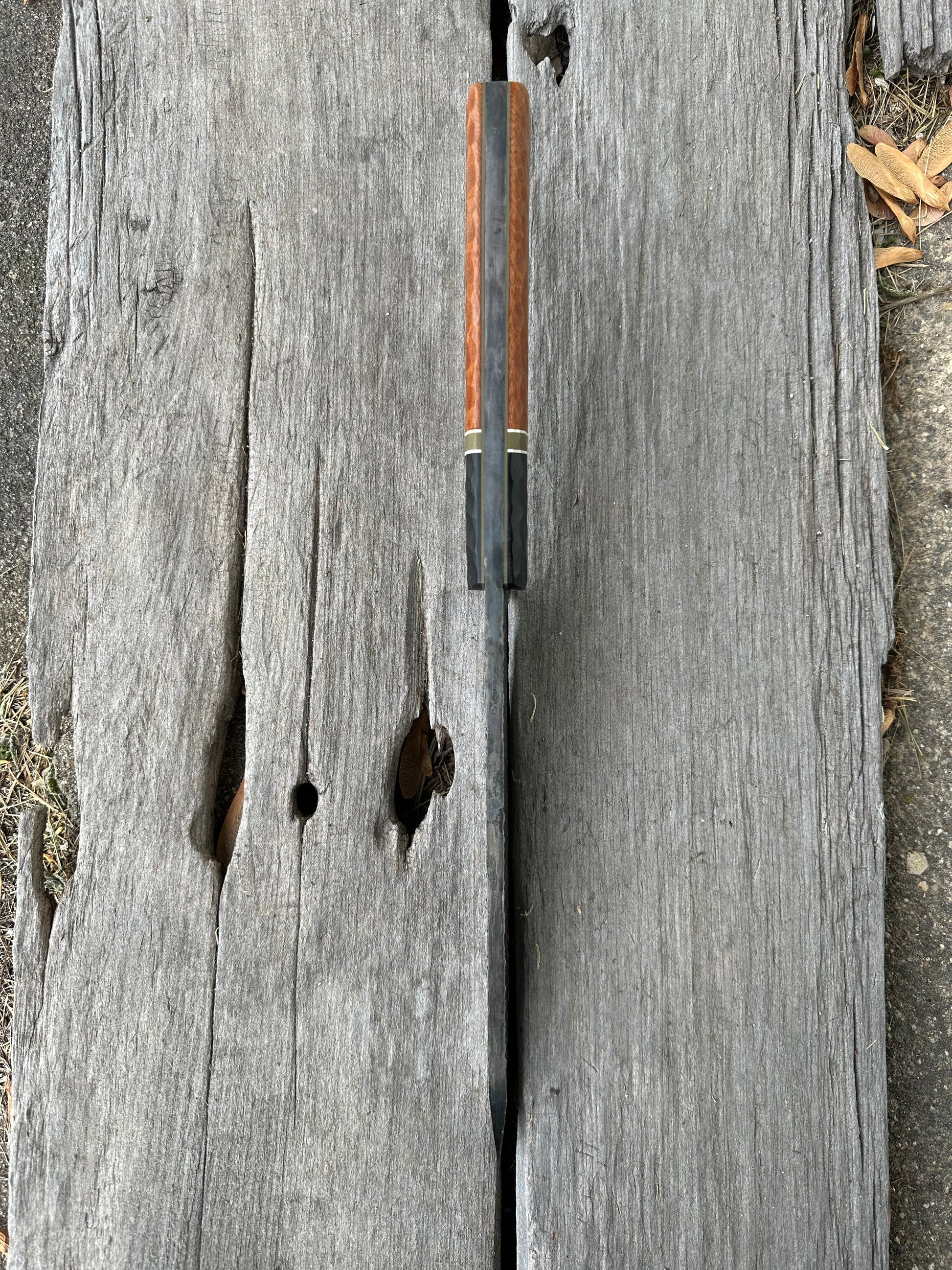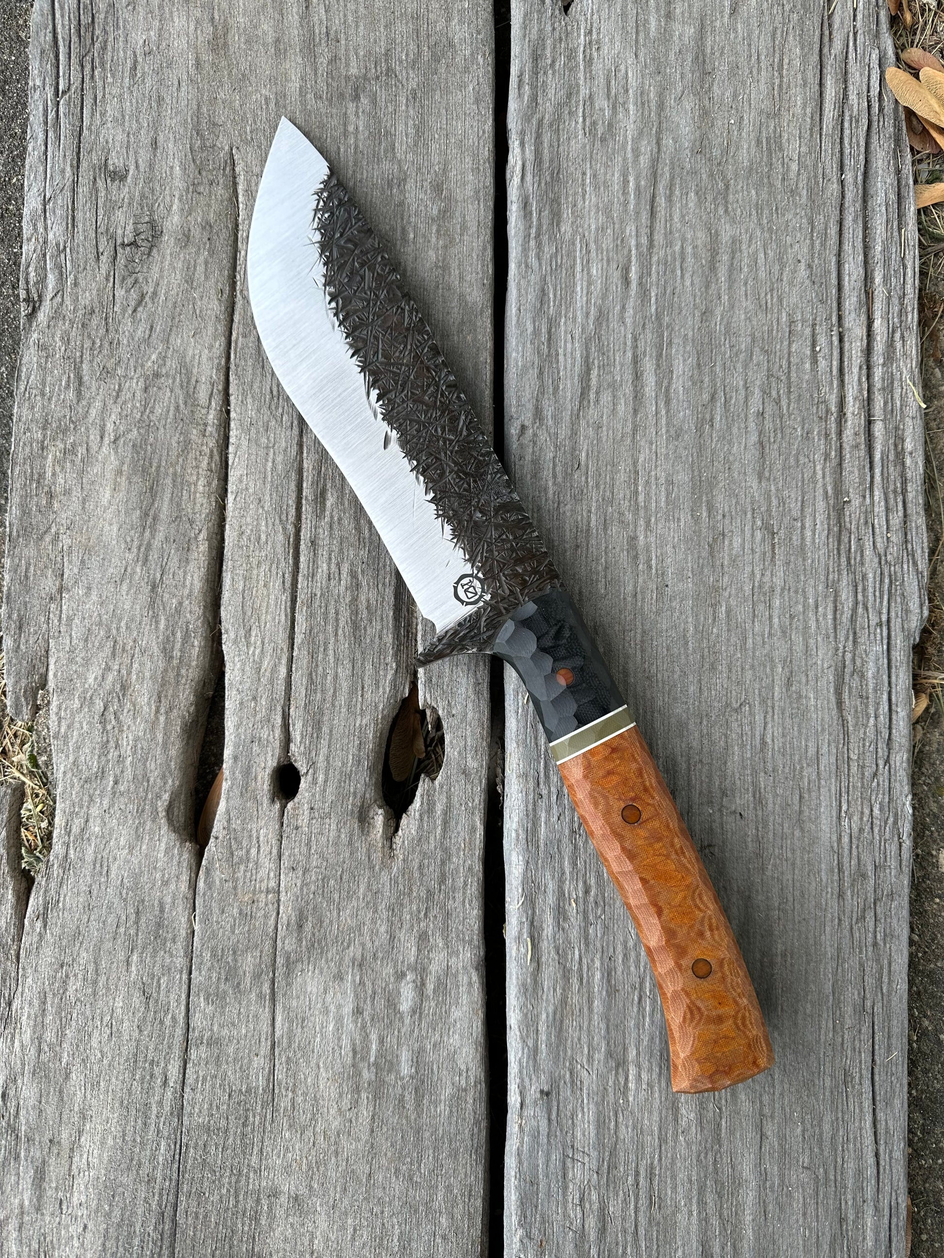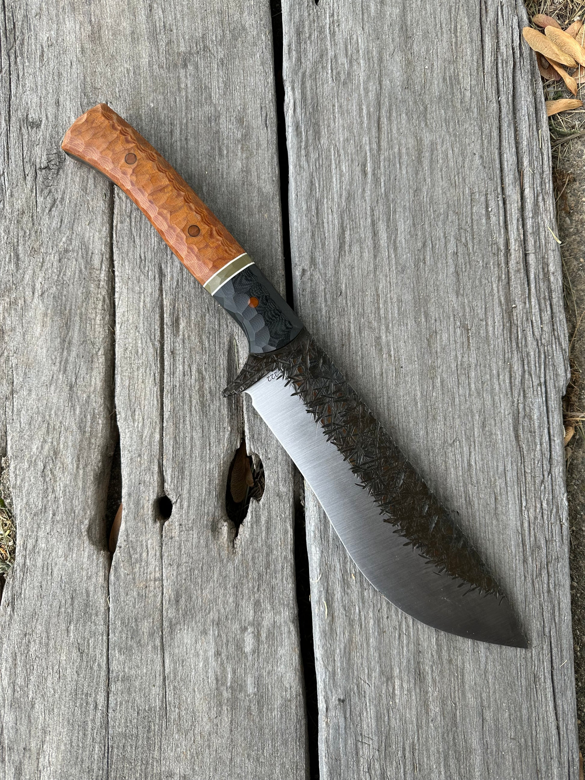 The first of the Truckie model. This is a massive blade for chopping and survival. The blade is 1/4” thick 8670 steel. The blade has been given a “mauled” finish with a satin bevel. The handle is hand made by me as well. It is made from g10 and micarta with micarta pins. It will come sharpened with a leather sheath. Thanks for checking it out.