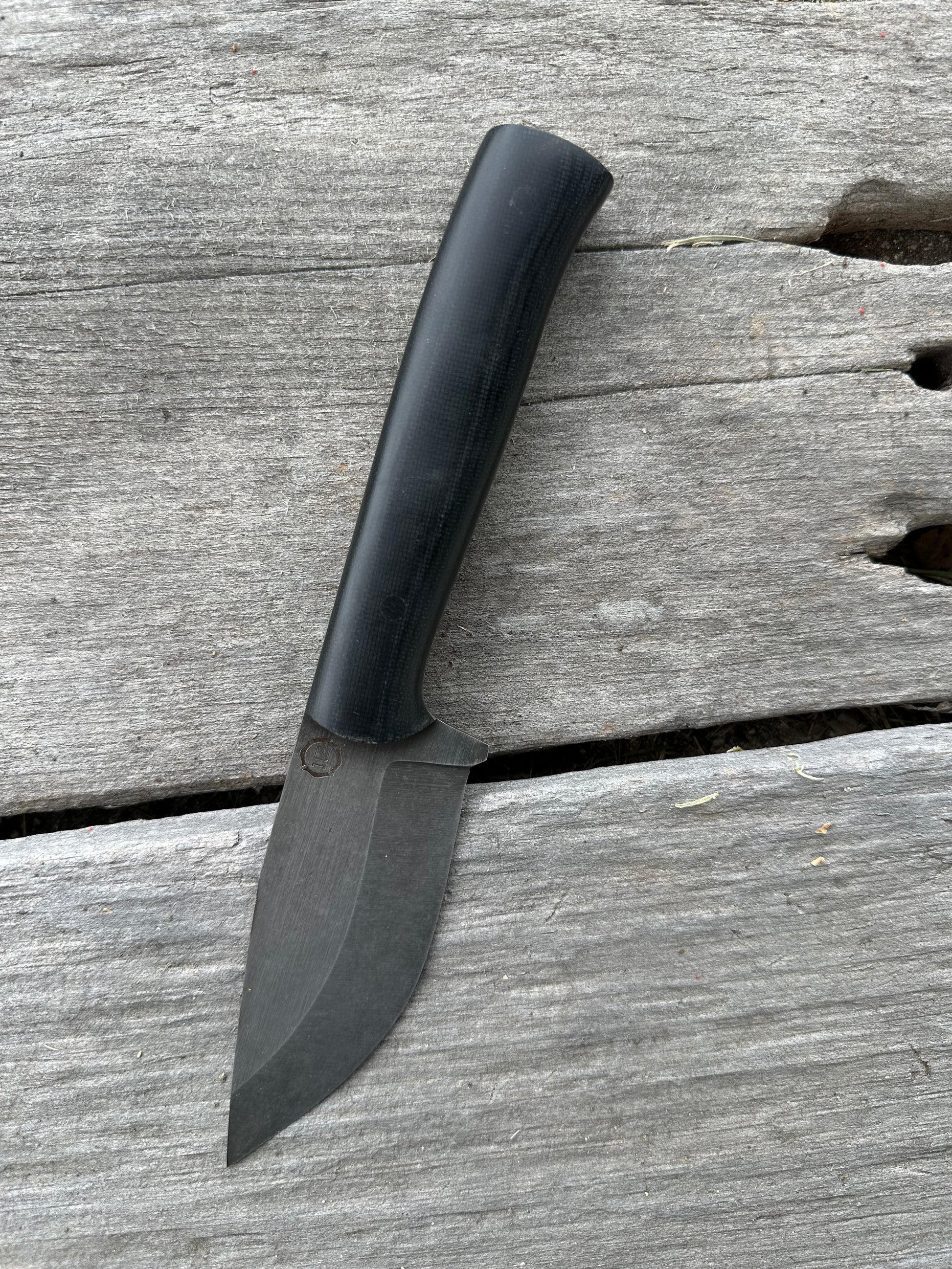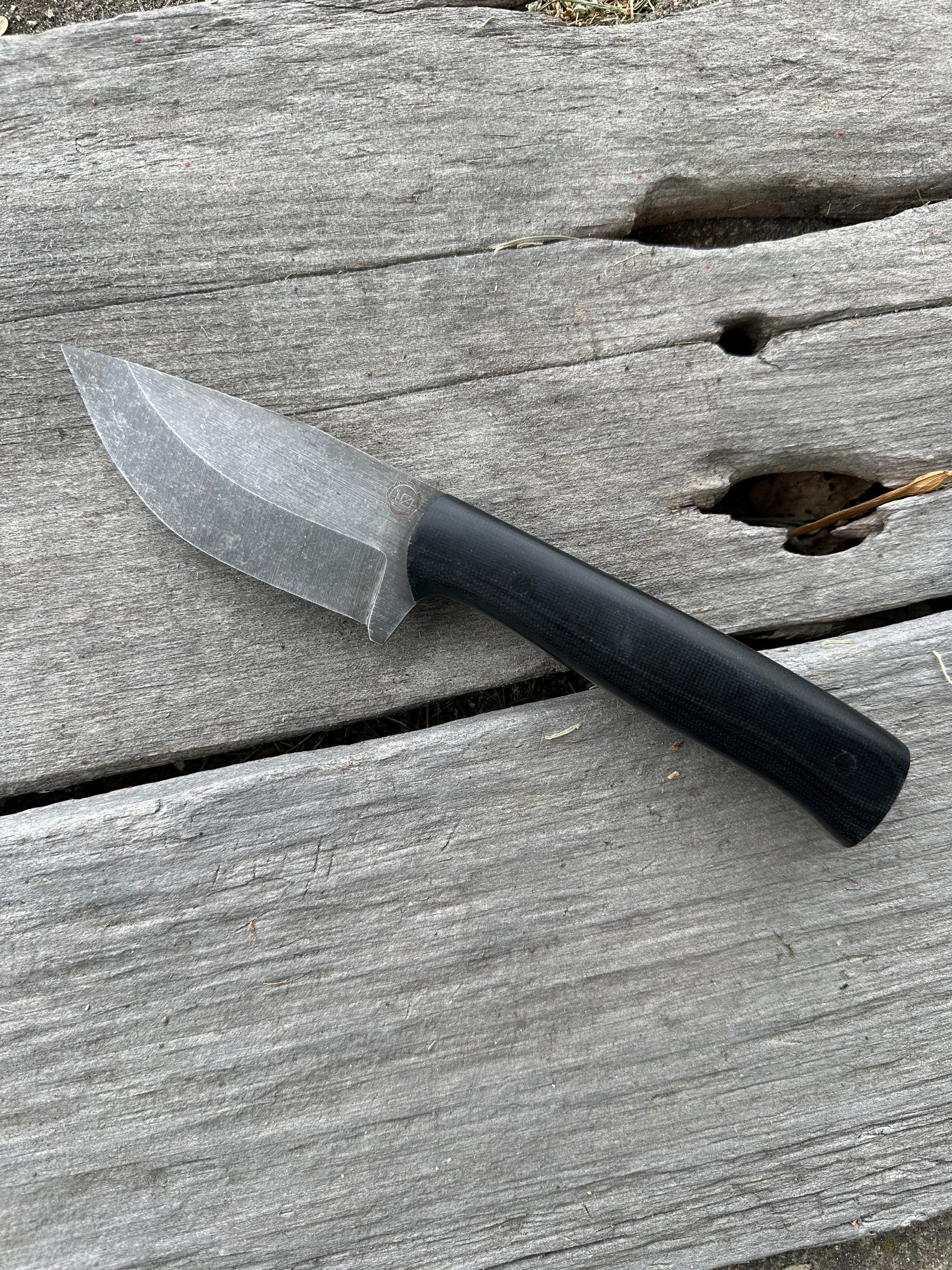 A beatiful blend between a drop point and a skinner. The belly on the blade allows this to be great at skinning and the drop point allows your hands to stay out of the stomach contents while you’re gutting. The blade is cpm154 with a stonewashed finish. The handle is all black micarta with black micarta pins as well. All my knives come razor sharp with a sheath.